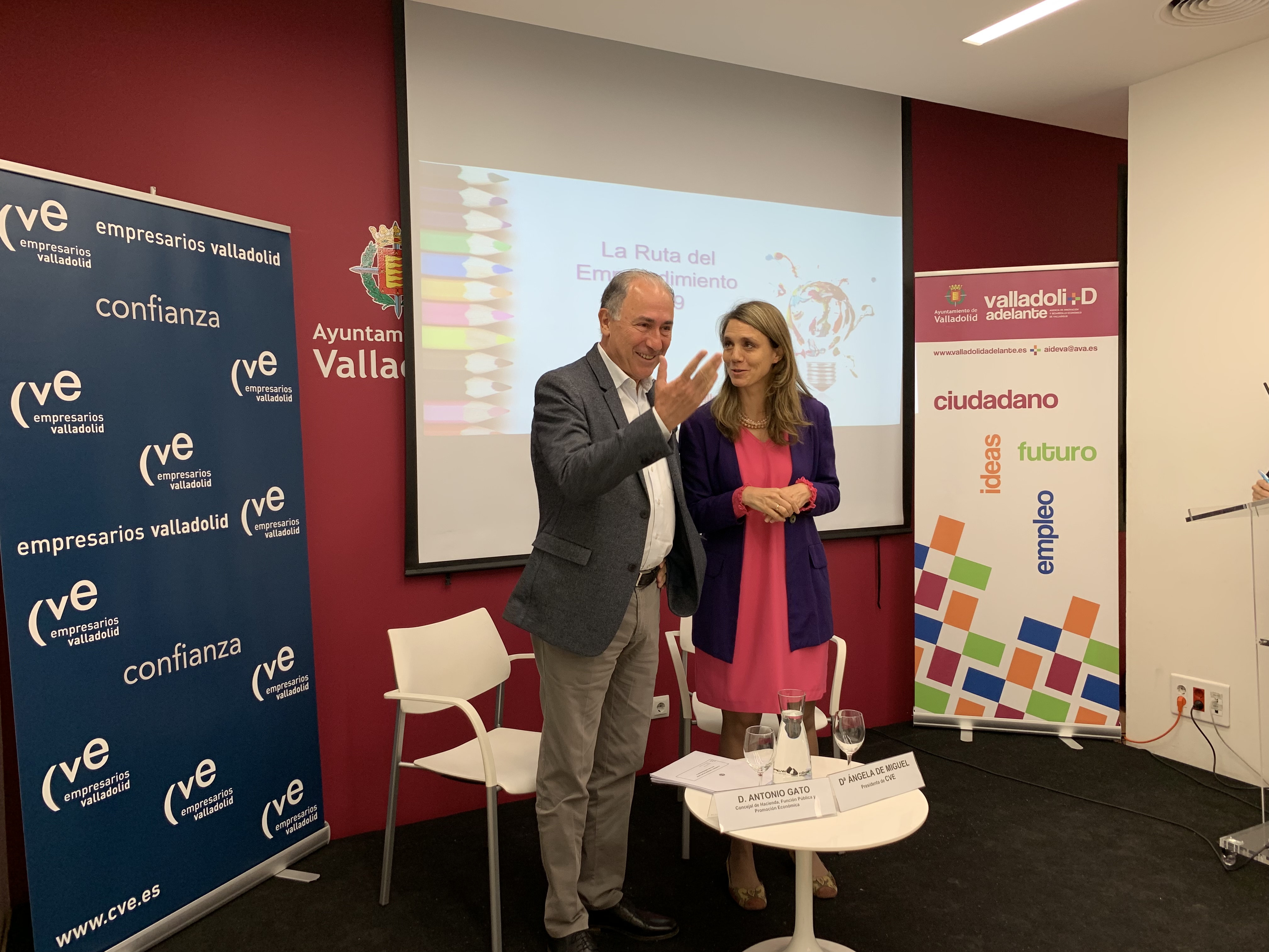 Hoy martes, 21 de mayo, se ha celebrado en la Agencia de Innovación y Desarrollo Económico de Valladolid el acto de clausura de la 2° Ruta del Emprendimiento. El concejal de Hacienda y Promoción Económica, Antonio Gato, y la presidenta de la Confederación Vallisoletana de Empresarios (CVE), Ángela de Miguel, han celebrado un encuentro con todos los participantes de la misma, como cierre de las actividades desarrolladas en el marco de este programa a lo largo del curso escolar.
