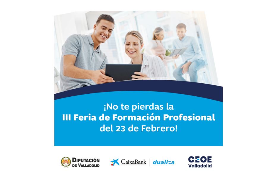 La III Feria de Formación Profesional organizada por CEOE Valladolid, CaixaBank Dualiza y la Diputación Provincial se celebrará el viernes 23 de febrero de 9:00 a 14:00 h en el Espacio La Granja de Valladolid bajo el lema “Haciendo camino”.