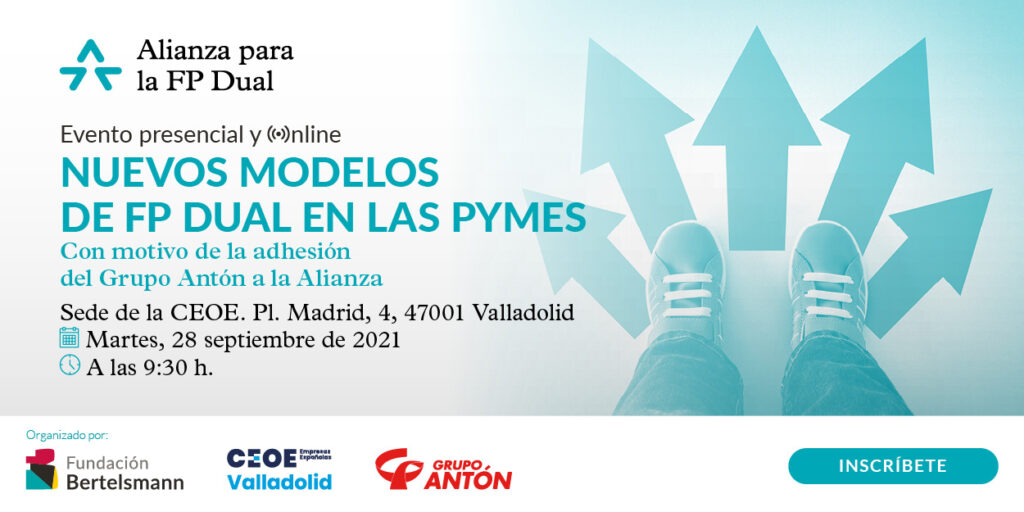 | NUEVOS MODELOS DE FP DUAL EN LAS PYMES Con motivo de la adhesión del Grupo Antón a la Alianza para la FP Dual 28 de septiembre 2021 | Presencial hasta completar aforo Formulario de inscripción: clic aquí |